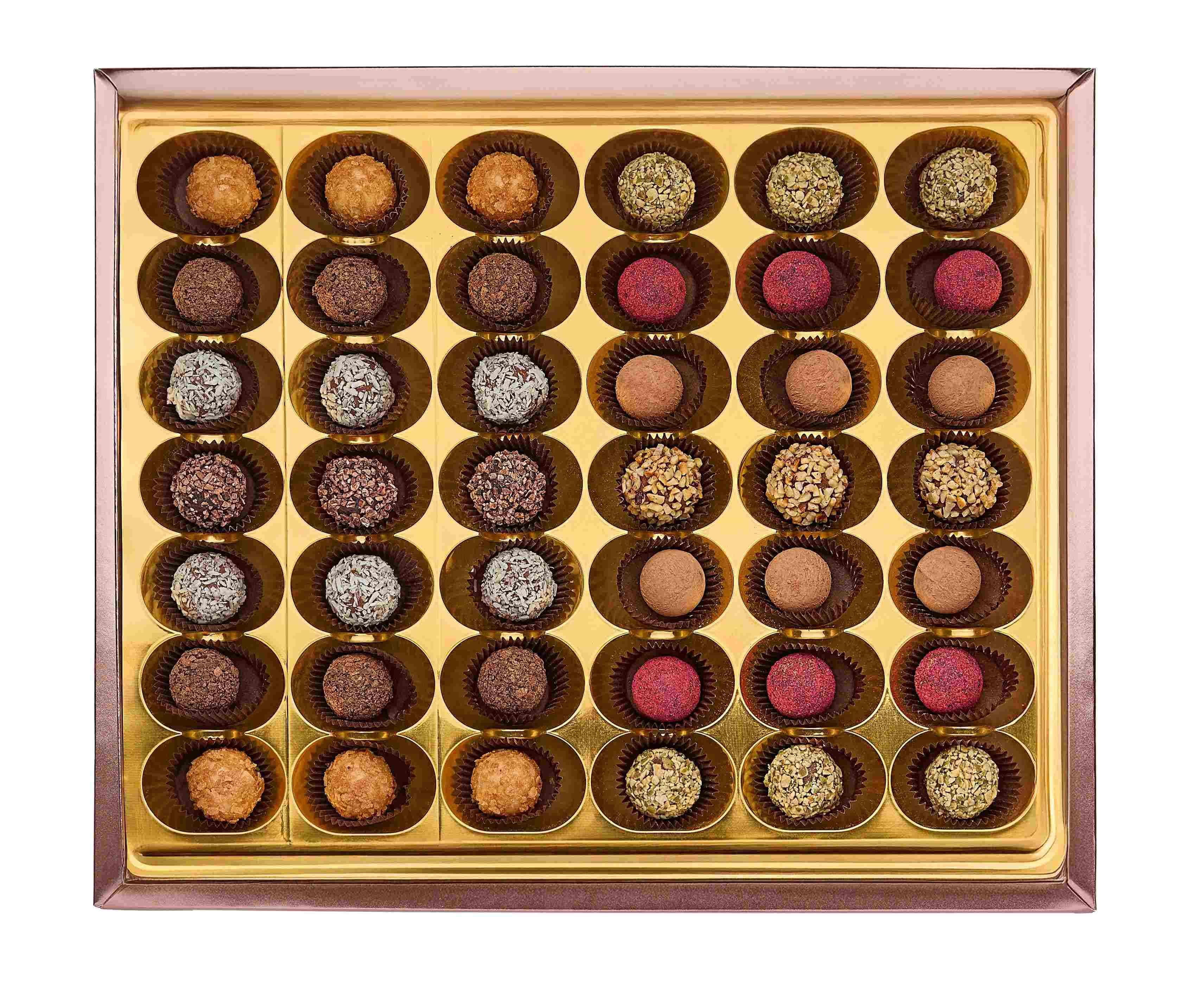 The "Special" collection brings together flavors from “Lounge” and “Avangard" collections; it is a bouquet of impressions from the texture of a unique sprinkling, taste of noble pure chocolate and the tenderness of a delicious cream filling. The collection combines truffles with cream fillings of grated hazelnuts with milk and chocolate flavors sprinkled with crushed hazelnuts, cocoa, chocolate and coconut flakes, saffron, crushed pumpkin seeds, waffle flakes and cocoa.